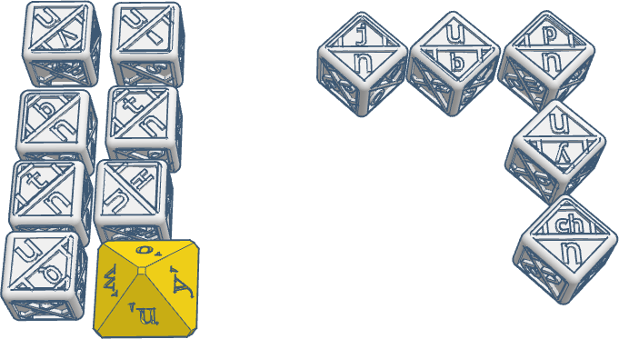 2023 habe ich die würfelförmigen Spielsteine von 2022 übernommen, aber statt (2D)gedruckten Spielflächen habe ich jetzt ein eigenes Spielbrett (3D)gedruckt.